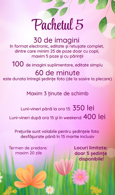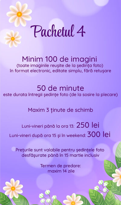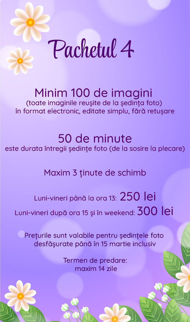 Veți primi doar numărul de imagini menționat în pachetul ales. În cazul tuturor pachetelor, fotograful va selecta cele mai reușite imagini de la ședința foto, pe care le va edita (și retușa, după caz).