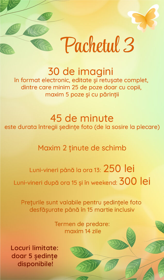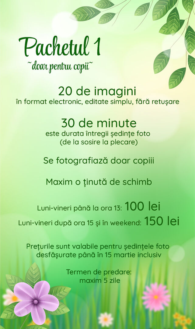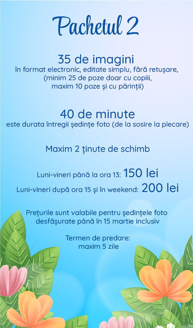 Timpul alocat unei ședințe foto este între 20 și 45 de minute, în funcție de pachetul ales, și include timpul necesar schimbării ținutelor. În timpul ședințe foto NU pot fi vizualizate pozele realizate pentru că aceasta ar implica întreruperi frecvente care pun în pericol reușita ședinței dumneavoatră și prelungesc nejustificat timpul alocat ședinței. Pentru bebelușii mai mici de 6 luni, ședința foto decurge diferit față de cea a copiilor mari. Este nevoie de recuzită și echipamente diferite, iar timpul alocat trebuie să fie mai mare; vă aștept cu mare drag, dar vă rog să solicitați o ofertă personalizată.